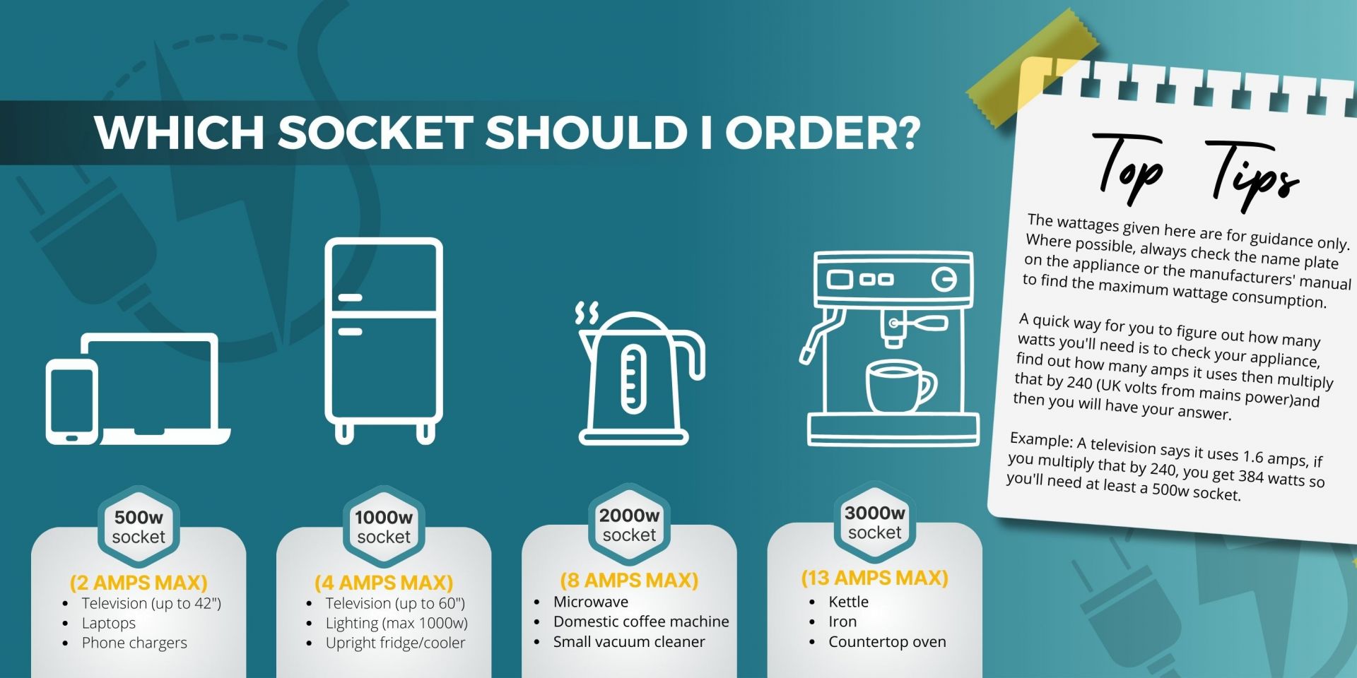 To figure out the wattage you need, check the amps your appliance uses and multiply by 240. For example, if a TV uses 1.6 amps, multiplying by 240 gives you 384 watts. Therefore, you'll need a socket that supports at least 500 watts.Here's a tip! The wattages provided are for guidance. Always check the appliance nameplate or manufacturer's manual for the maximum wattage.